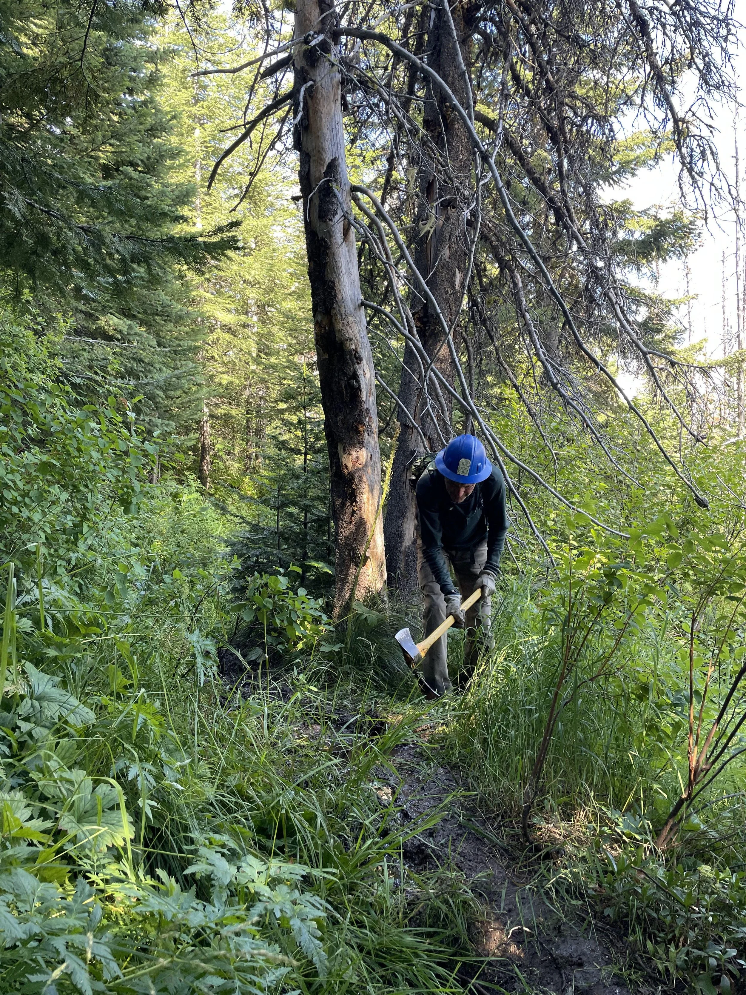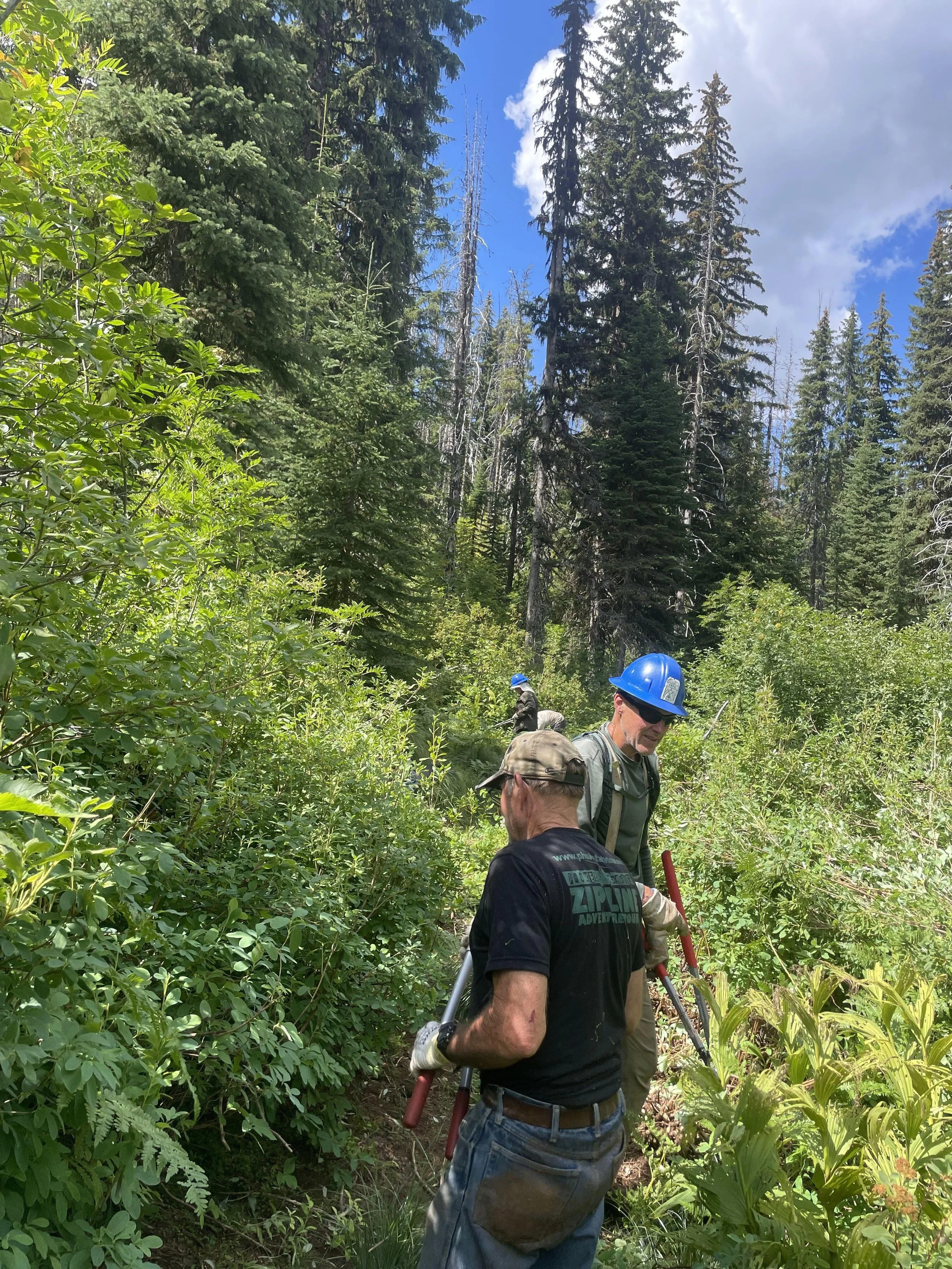 One of us was brave enough to face the weather, our fifth crew mate Dan. Dan was so motivated to help the trail that he arrived early that day, worked through the rain, and spent the entire day lopping. I am sure that those reading this newsletter have an idea of how difficult loping or clearing brush out of the way of the trail is. Now imagine it in a nickel sized hail storm as you’re volunteering your time. This guy was crazy, in an awesome way. He runs the Hiking North Central Idaho trail group that is looking for volunteers if you’re interested!