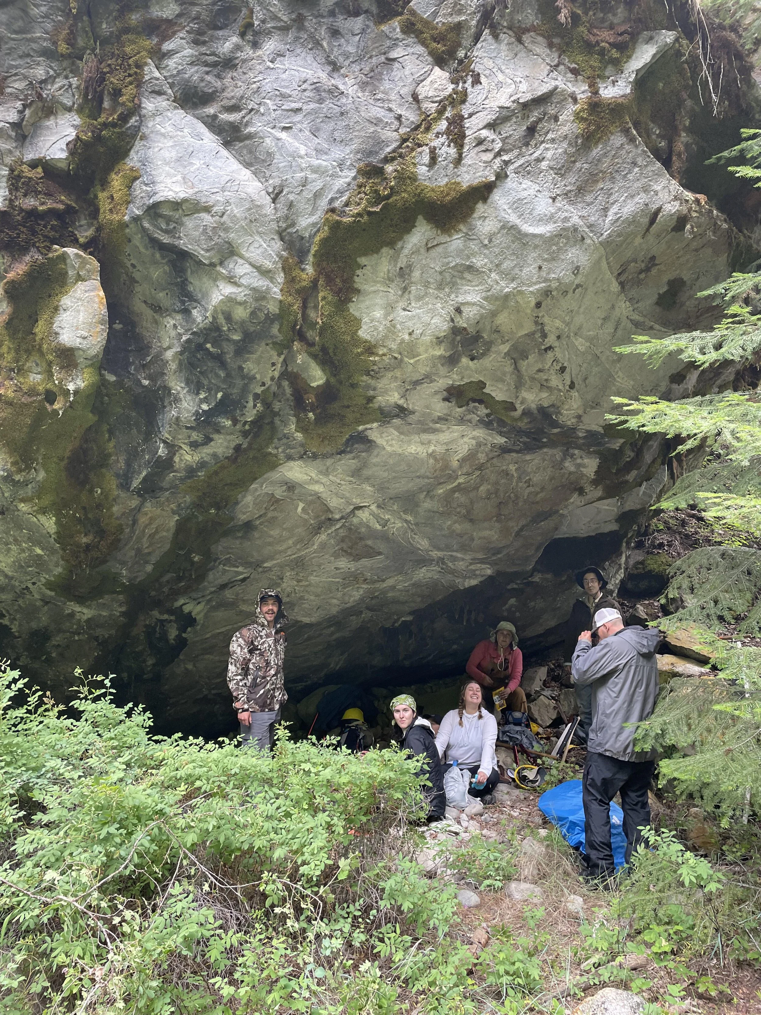 Graduate students and Bert taking shelter beneath a large boulder