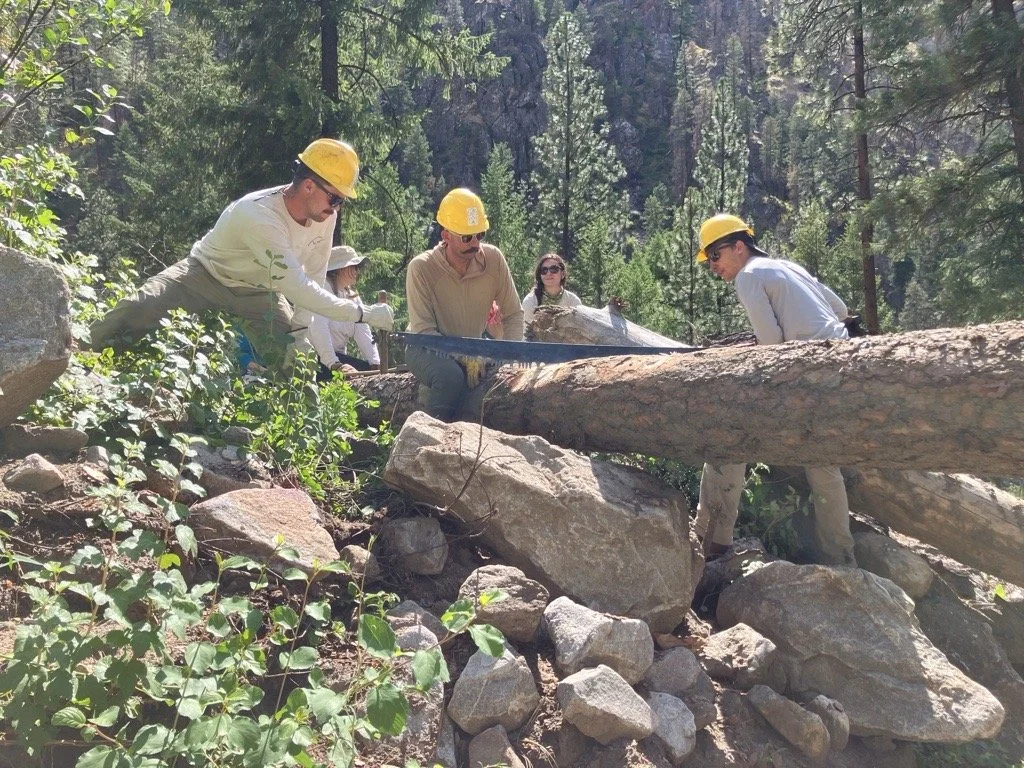 Our assigned project is to clear trees and brush along Bargamin Creek Trail #502. Earlier in the day, we had to seek shelter under a large rock because the rain was coming down hard. Students cleared trees with the “misery whip” or crosscut saw. They pushed cut tree segments off the trail by sitting four in a row and pushing with their legs. Now, I look up at our camp and see students who are tired, some letting the cold river water run over their aching bodies, eating snacks, journaling. Some are laying on their sleeping pads, hats over their faces, asleep. I think to myself, this is the point.
